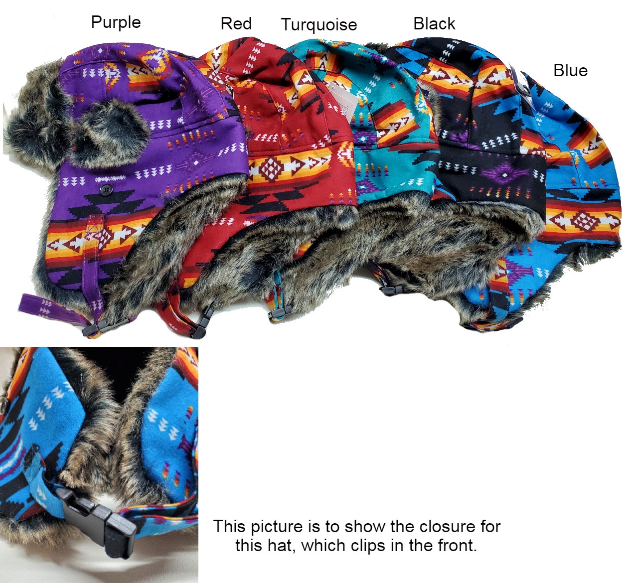 These trapper hats are fur lined and come in Southwest/Native print designs.